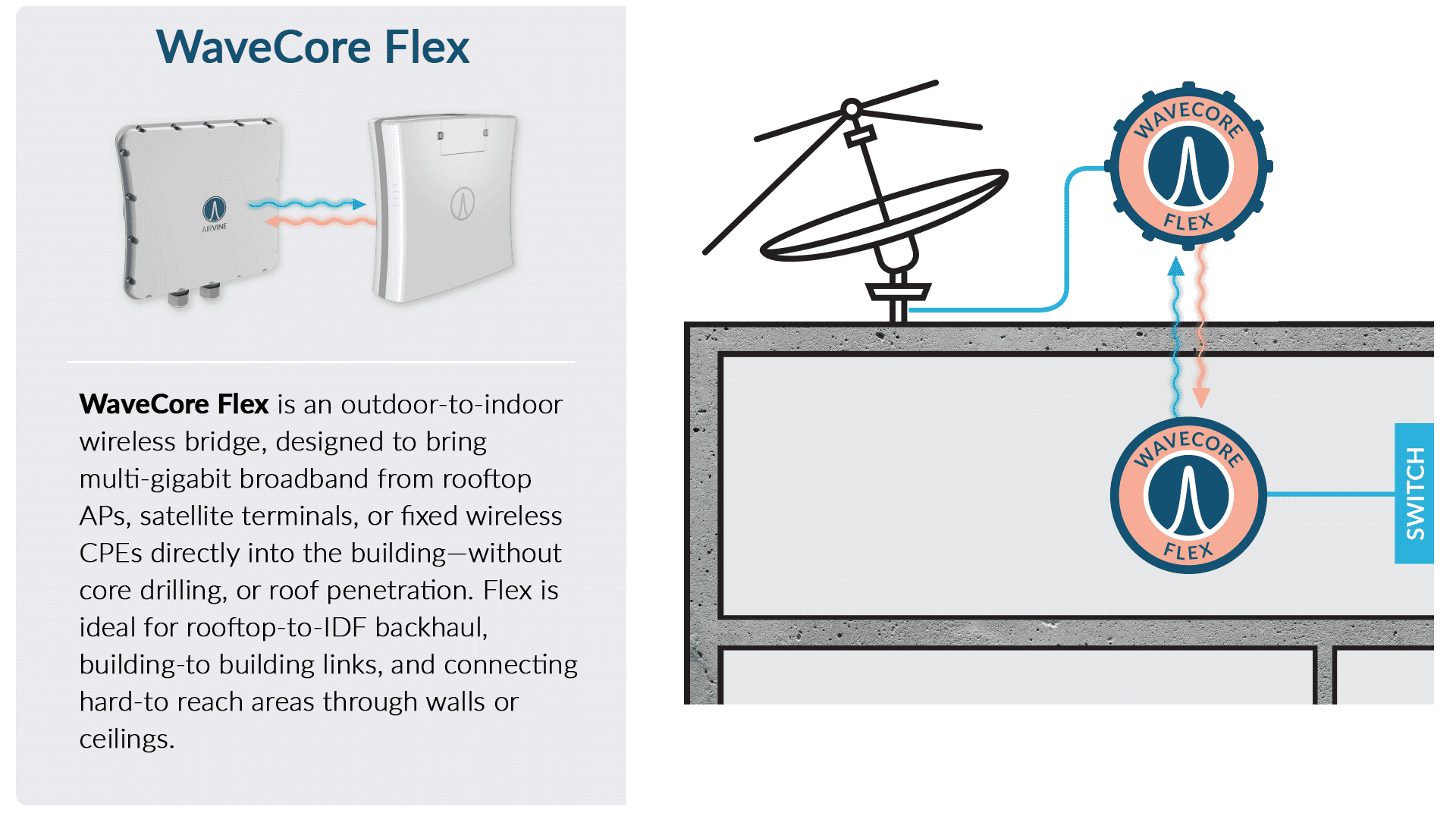 WaveCore Flex is a high-speed, wireless bridge that connects to rooftop or exterior-mounted satellite terminals to your internal network without core drilling, roof penetration, or trenching.