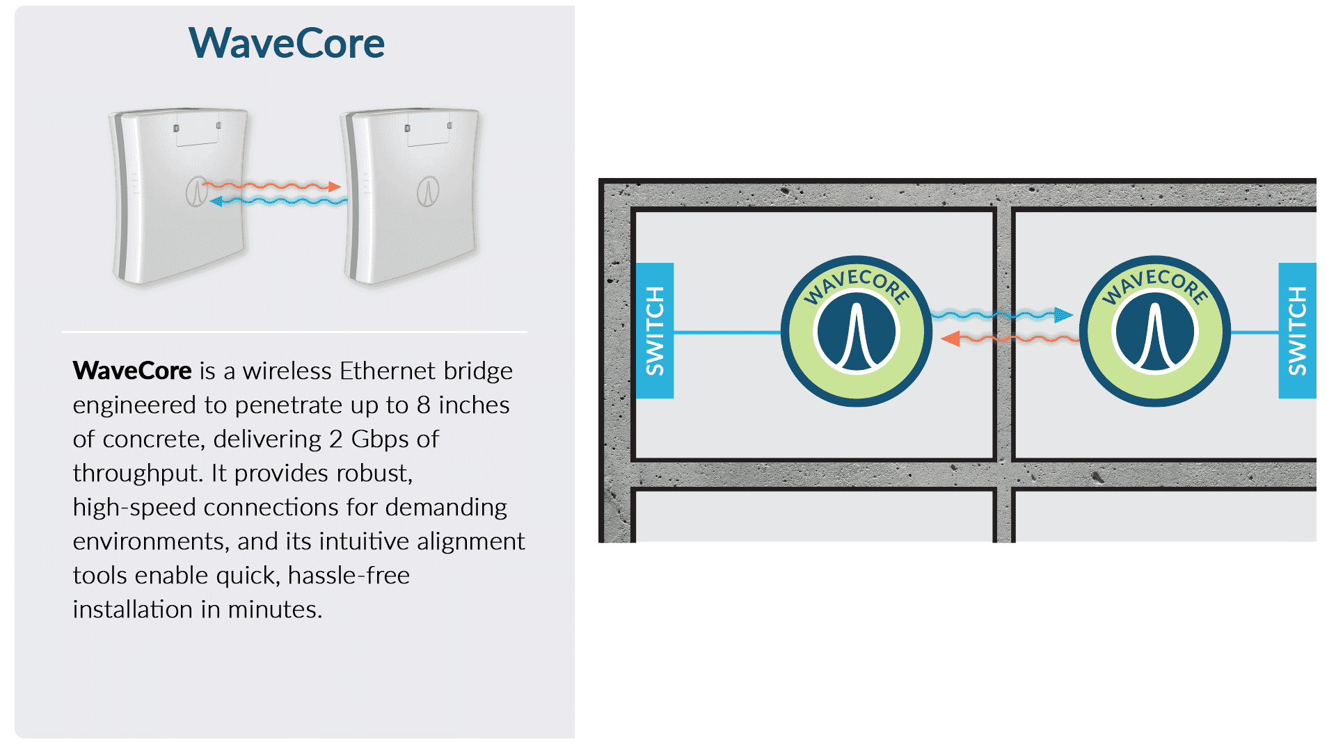 WaveCore is a wireless Ethernet bridge engineered to penetrate up to 8 inches of concrete, delivering 2 Gbps of throughput.